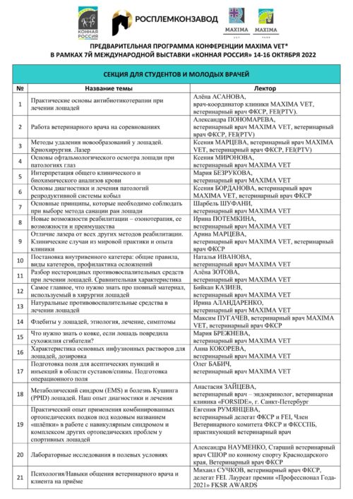 14-15 октября на площадке Maxima Park в рамках 7й Международной выставки «Конная Россия» ветеринарная клиника Maxima Vet организует ряд мероприятий, интересных и познавательных не только для специалистов в области ветеринарии лошадей, но и для владельцев лошадей и спортсменов.