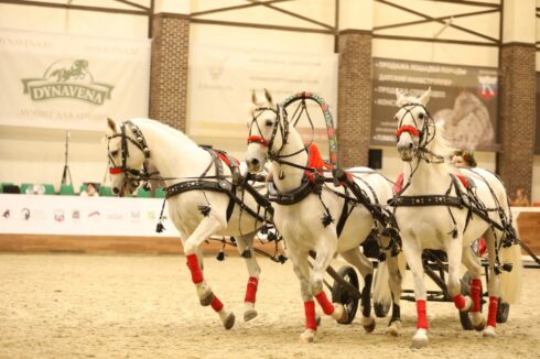 Ярким вступительным аккордом Чемпионата России стало появление на манеже тройки Московского конного завода №1, под управлением Александра Каурковского!