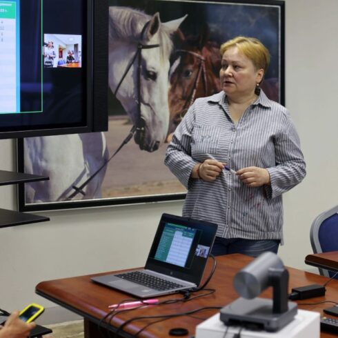 С приветственных слов Александра Михайловича Зайцева (директор ВНИИК), Егора Владимировича Мелентьева (Генеральный директор Ассоциации «Росплемконзавод») и Юрия Борисовича Прохорова (Директор Московского конного завода №1) началась официальная часть мероприятия. На круглом столе обсуждались проблемы развития породы, методы ее поддержки и популяризации, перспективы использования терских лошадей. С докладами выступили: Анна Дорофеева (регистратор породы ВНИИК), Татьяна Муравейник (Федерация конного спорта России), Любовь Понькина (проект «Терец»), на связи через zoom -конференцию проинформировали о ситуации на данный момент в Ставропольском конном заводе и состоянии лошадей Тамара Калашникова и председатель Ветеринарного комитета ФКСР Мария Андреева.