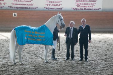 На фото — Ю.Б.Прохоров, генеральный директор ОАО «Московский конный завод № 1» и граф Доминик де БЕЛЛЕГ, президент французской рысистой ассоциации — вручает Канюку именную попону.