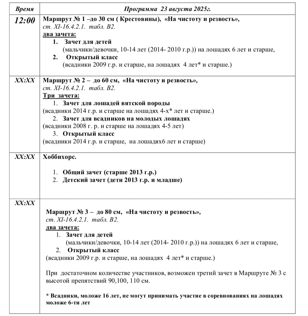 На соревнованиях 23 августа будут специальные зачеты для всадников на лошадях вятской породы. Соревнования пройдут на открытом грунте, предварительные заявки принимаются до 21 августа через WhatsApp: 8-926-848-60-94.